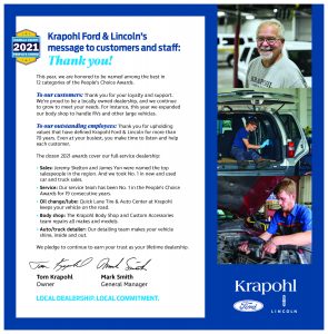 Not long ago, we found a 20-year-old newspaper in a file cabinet with a full-page advertisement that named every Krapohl Ford & Lincoln employee, thanking them for earning numerous People’s Choice Awards.